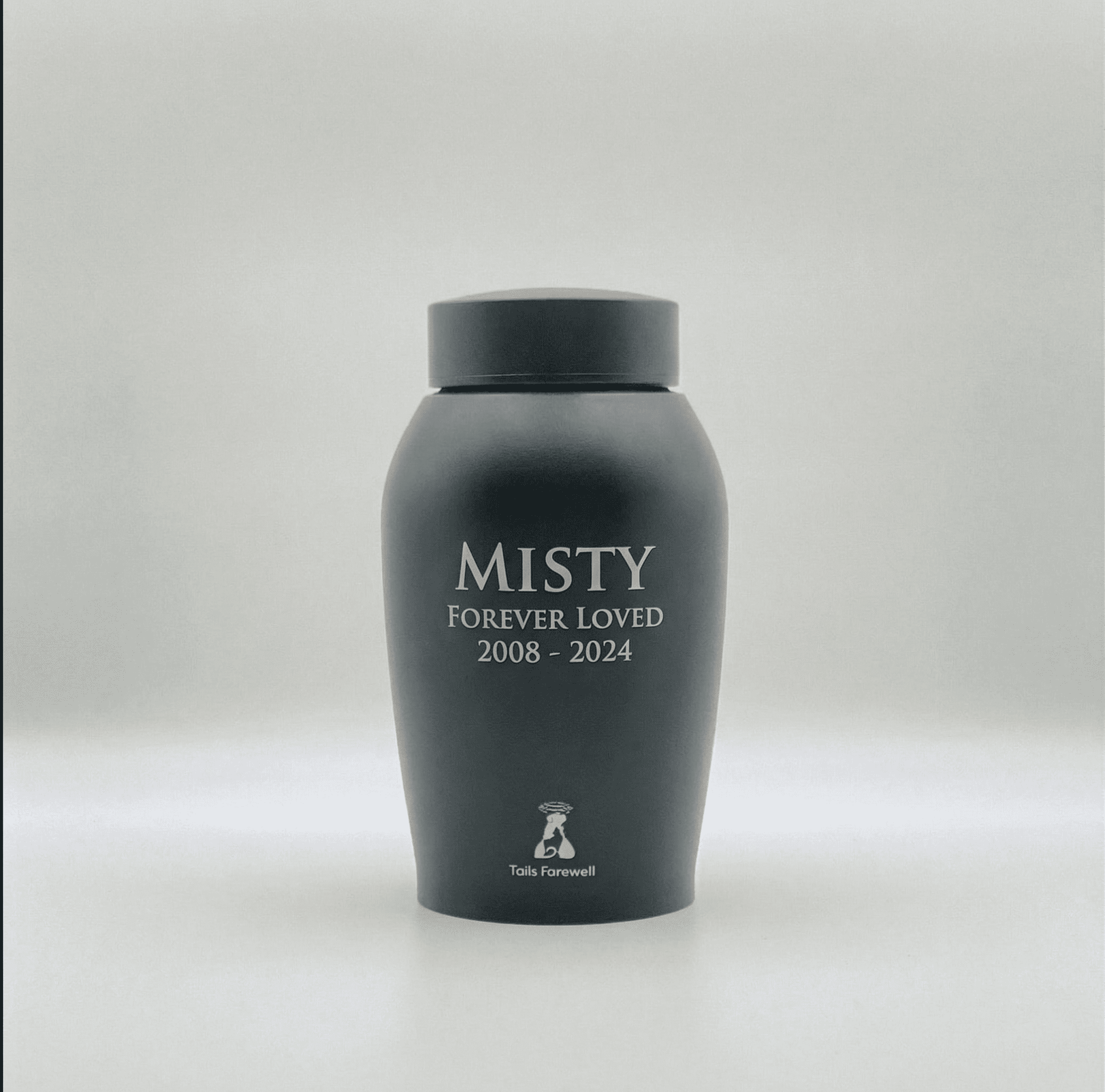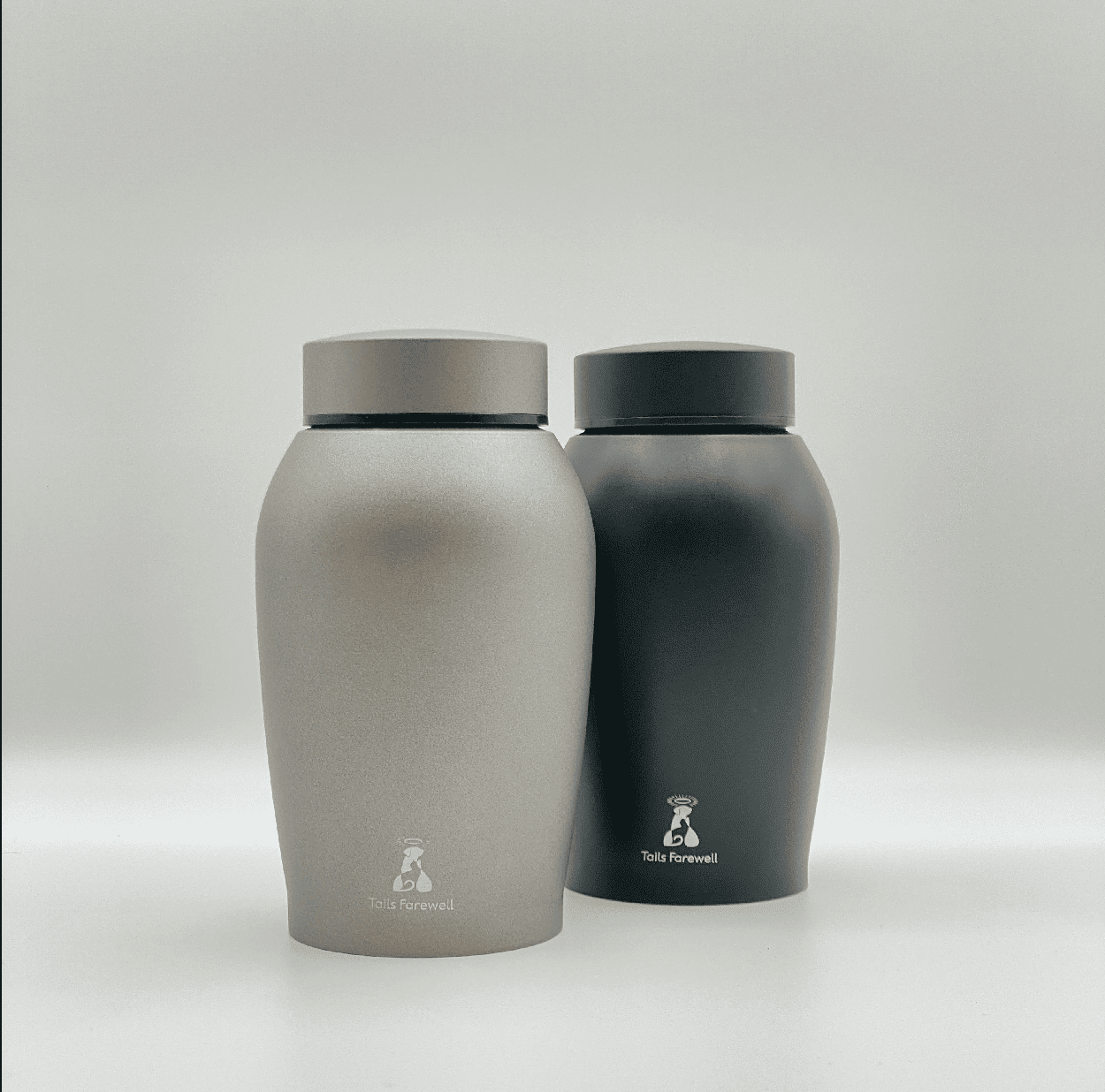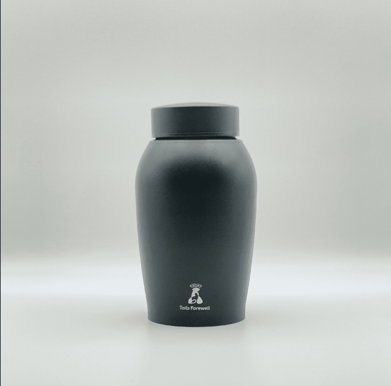 A quiet, lasting tribute to the companion who was always by your side. The Classic Metal Pet Urn by Tails Farewell is crafted from solid brass with a brushed matte finish, available in Black or Grey. The threaded screw-top lid closes securely, so you can place it anywhere in your home with complete peace of mind. Capacity: approximately 30 cubic inches - suitable for pets up to 30 lbs. Dimensions: 6" H × 4" W. Each urn can be personalized with engraved text (included at no extra cost). Arrives in a protective velvet pouch.