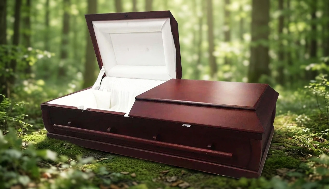 A breathtaking natural mahogany stained veneer poplar casket in a rich matte finish, designed to honour your loved one with grace and dignity. The LongKay features a pristine white velvet interior with a coordinating pillow and overlay, creating a serene and comforting final resting space. Crafted specifically for cremation purposes, this casket includes minimal metal components — all of which can be easily removed when needed — along with a thin mattress for added care and comfort. The deep mahogany tone and clean wood grain reflect both warmth and elegance, making it a meaningful choice for families seeking quality and simplicity. Backed by over 20 years of expert wood construction experience, every Haven Casket is manufactured to meet or exceed the premium standards of caskets typically found in funeral homes, ensuring peace of mind during one of life's most sacred moments.